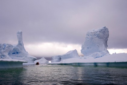 Zodiac cruising in the iceberg-studded Paradise Harbour on the Antarctic Peninsula.