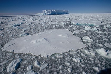 Ice floes in the Ross Sea, The ice between freezes in the cold nights, Iceberg on horizon, Antarctica.