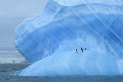 Chinstrap Penguins rest on a blue iceberg of ancient ice sculpted by the sea water, Antarctica