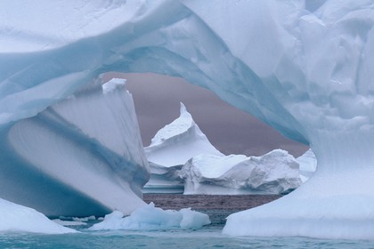 Pointed iceberg seen through a hole in an iceberg near Pleneau Island. Antarctic Peninsula