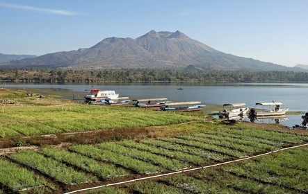 • Onions grown on the irrigated shores of Lake Batur with the volcano Gunung Batur in the background with tourist boats tied up on lakeside Kedisan Penelokan Bali .