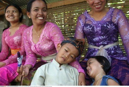 • INDONESIA / Bali / .A Balinese woman with her children and other female relatives, dressed up for a wedding, wait for a bus at Banjar in North Bali......© Prashant Panjiar / Anzenberger