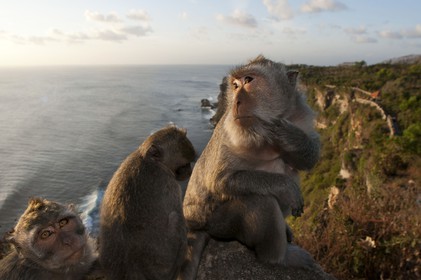 • Monkeys along the cliffs next to the Ulu Watu temple Pura Luhur. Bali. Uluwatu Temple is a Hindu temple set on the cliff bank in south part of Bali Peninsula. It is one of Sad Kahyangan Temple in Bali (six big groups of Bali Temples)