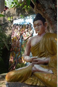 • INDONESIA / Bali / .A statue of Lord Buddha under a tree with a mural on the wall behind at the Banjar Monastery in North Bali. .....© Prashant Panjiar / Anzenberger