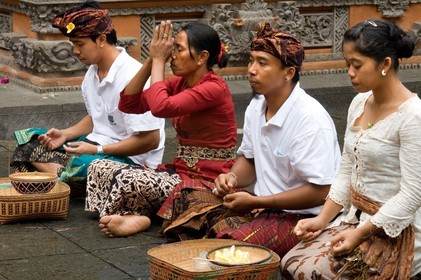 • A BALINESE family and friends prays at PURA TIRTA EMPUL a Hindu Temple complex and cold springs - TAMPAKSIRING, BALI, INDONESIA. Several people pray and leave offerings in the Holy Monkey Forest during the celebration of Galungan.