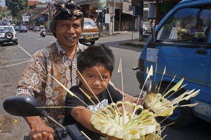 • Father with his son in a motorbyke. Hindu Rituals and celebrations in the near Kuta temple, Bali, Galungan celebrations Bali Indonesia