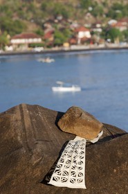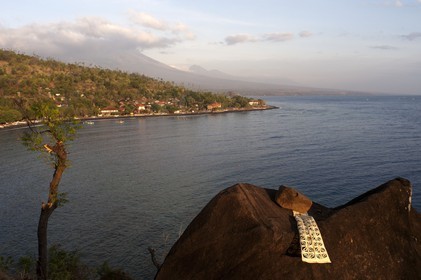 • A prayer on a rock overlooking the small fishing village of Amed, with Gunung Agung mountain background (3142m). East Bali.