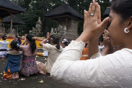 • Indonesia, Bali, Mas, temple festival, people praying, odalan, Kuningan holiday,