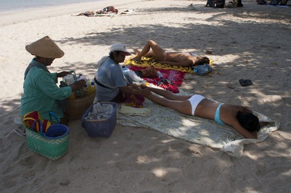 • Indonesia, Bali, Kuta, beach, woman food massage. Sunbath on the beach of Kuta. Surfing lessons. Bali. Kuta is a coastal town in the south of the island of Lombok in Indonesia.