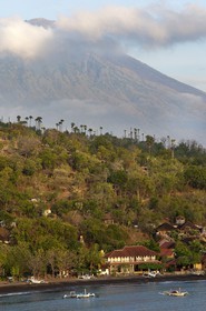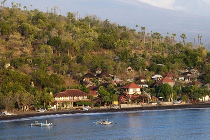 • The small village of Amed fisherman with views of Mount Gunung Agung background (3142m). East Bali. Amed is a long coastal strip of fishing villages in East Bali.