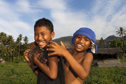 • Two young people having fun in a field near the fishing village of Amed East Bali culture. Amed is a long coastal strip of fishing villages in East Bali. Amed refers to a long stretch of coast running from the village of Cucik about 14 km eastwards incorporating the seven villages