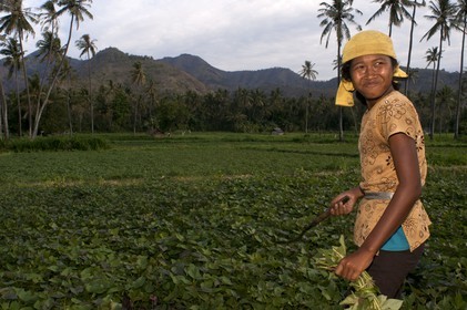 • An girl collects harvest in a field near the fishing village of Amed East Bali culture. Amed is a long coastal strip of fishing villages in East Bali. Amed refers to a long stretch of coast running from the village of Cucik about 14 km eastwards incorporating the seven villages