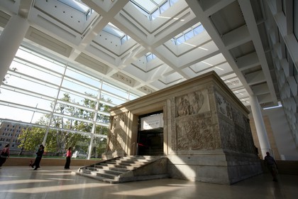 Rome, EUR district: the Colisee Square (1938) draws its great white mass punctuated by six storeys of arches above the Tiber. Italy, Rome