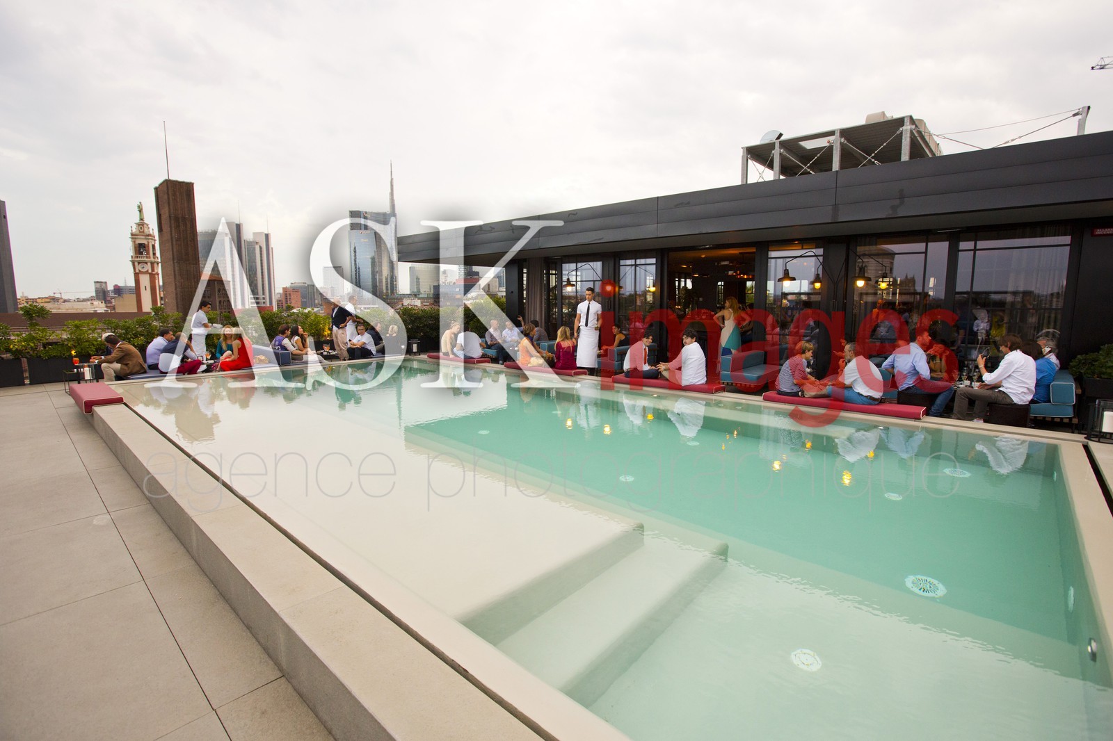Modern bar with swimming pool, the Ceresio 7, Milan, Italy