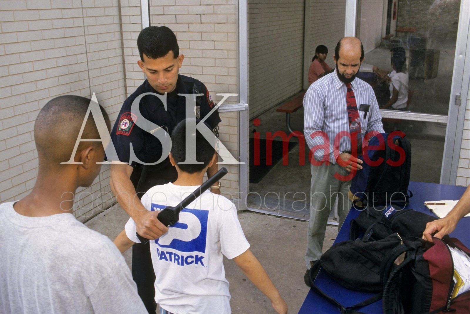 | Description | Texas: A school police officer uses a metal detector and a teacher inspects backpack of students entering a junior high school. MR ©Bob Daemmrich / The Image Works |