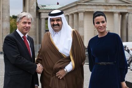 Berlin Major Klaus Wowereit (C), accompanies the Emir of Qatar, Hamad bin Khalifa Al Thani (L), and his wife Mozah Binti Nasser Al Missned (R), to the landmark Brandenburg Gate in Berlin, Germany.