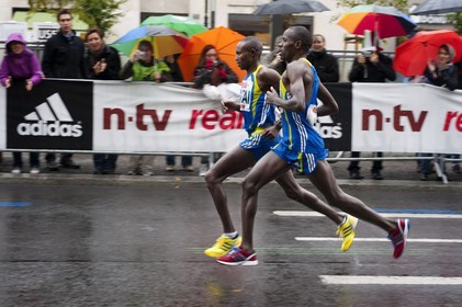 Black African participant of the Berlin Marathon at kilometer 40, Berlin, Germany, Europe. The Berlin Marathon (branded BMW Berlin Marathon for sponsorship reasons) is a major running and sporting event held annually in Berlin, Germany.