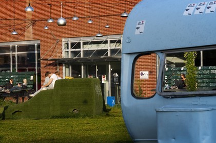 Berlin, Germany, on a old bus in Arena Berlin. Oversized benches and cars covered in grass at Arena Berlin. Cultural events in a listed factory building along the former GDR border. Today, this 7,000 sqm venue at the edge of the Spree River is the site for countless concerts, fairs and parties