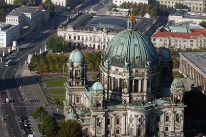 Berlin Cathedral, aerial landscape viewed from the TV tower, Berlin. The Berliner Dom (Berlin Cathedral), completed in 1905, is Berlin’s largest and most important Protestant church as well as the sepulchre of the Prussian Hohenzollern dynasty.