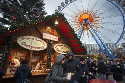 Ferris wheel and currywurst at the Christmas market in front of the Neptunbrunnen fountain, Alexanderplatz, Berlin. Snack Bar at Alexanderplatz .