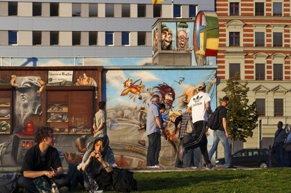 Germany, Berlin. A relaxing afternoon on the lawn of the East side gallery along the Spree. The East Side Gallery is an international memorial for freedom. It is a 1.3 km long section of the Berlin Wall located near the centre of Berlin on Muhlenstrasse in Friedrichshain-Kreuzberg.