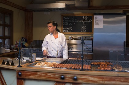 Famous Curry 36 sausage restaurant Kreuzberg west Berlin Germany Europe. If you want to eat currywurst the Berlin way, order yours here boiled and naked ("ohne darm", without skin), looking a little pale in comparison with the ones in pink skins.