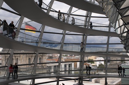 Mirrored cone inside the Reichstag Dome, in the german parliament (Reichstag), Berlin. The current Reichstag dome is an iconic glass dome constructed on top of the rebuilt Reichstag building in Berlin.