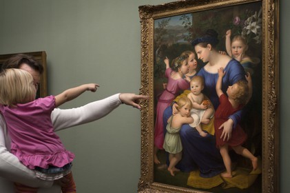 A father and daughter look frescoes from the Casa Bartholdy in Rome at the Alte Nationalgalerie in Berlin Germany. Children in the museum.