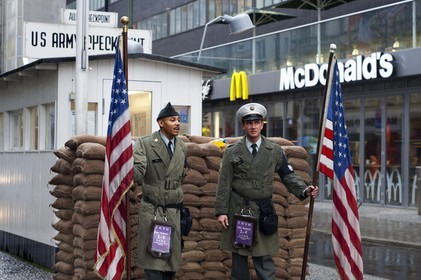 Actors dressed as American and Soviet soldiers pose for photos with tourists in front of the Brandenburg Gate in Berlin, one of the Cold War's most iconic landmarks.