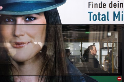 Berlin, Germany, advertising and passengers of a bus. Berlin buses are operated by BVG, the public bus service network of Berlin, Germany.