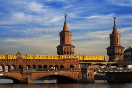 Germany, Berlin, the Oberbaumbrucke bridge that links Kreuzberg and Friedrichshain districts over the Spree river. The Oberbaum Bridge (German: Oberbaumbrucke) is a double-deck bridge crossing Berlin's River Spree, considered one of the city landmarks.