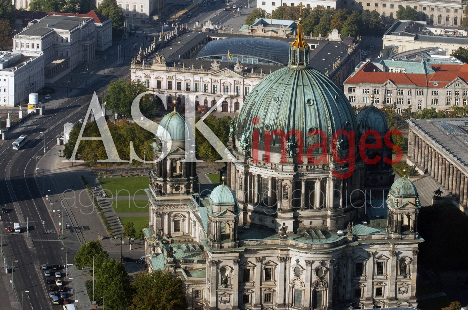 | Description | Berlin Cathedral, aerial landscape viewed from the TV tower, Berlin. The Berliner Dom (Berlin Cathedral), completed in 1905, is Berlin’s largest and most important Protestant church as well as the sepulchre of the Prussian Hohenzollern dynasty. |