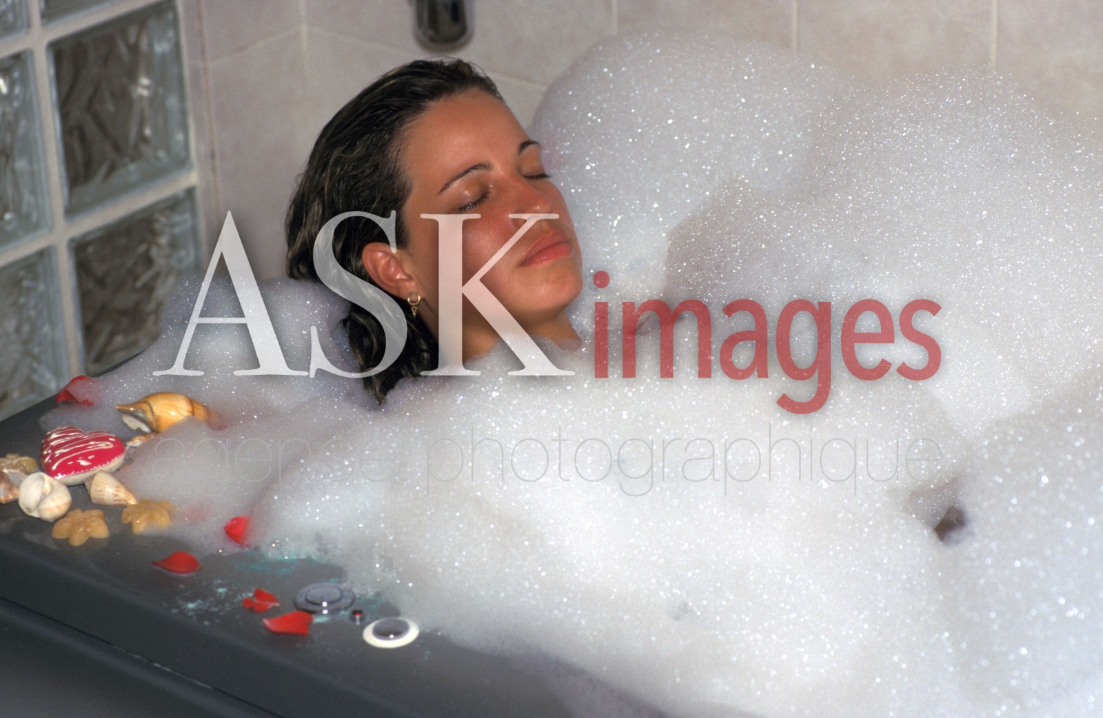 DescriptionWoman relaxing in a bubble bath