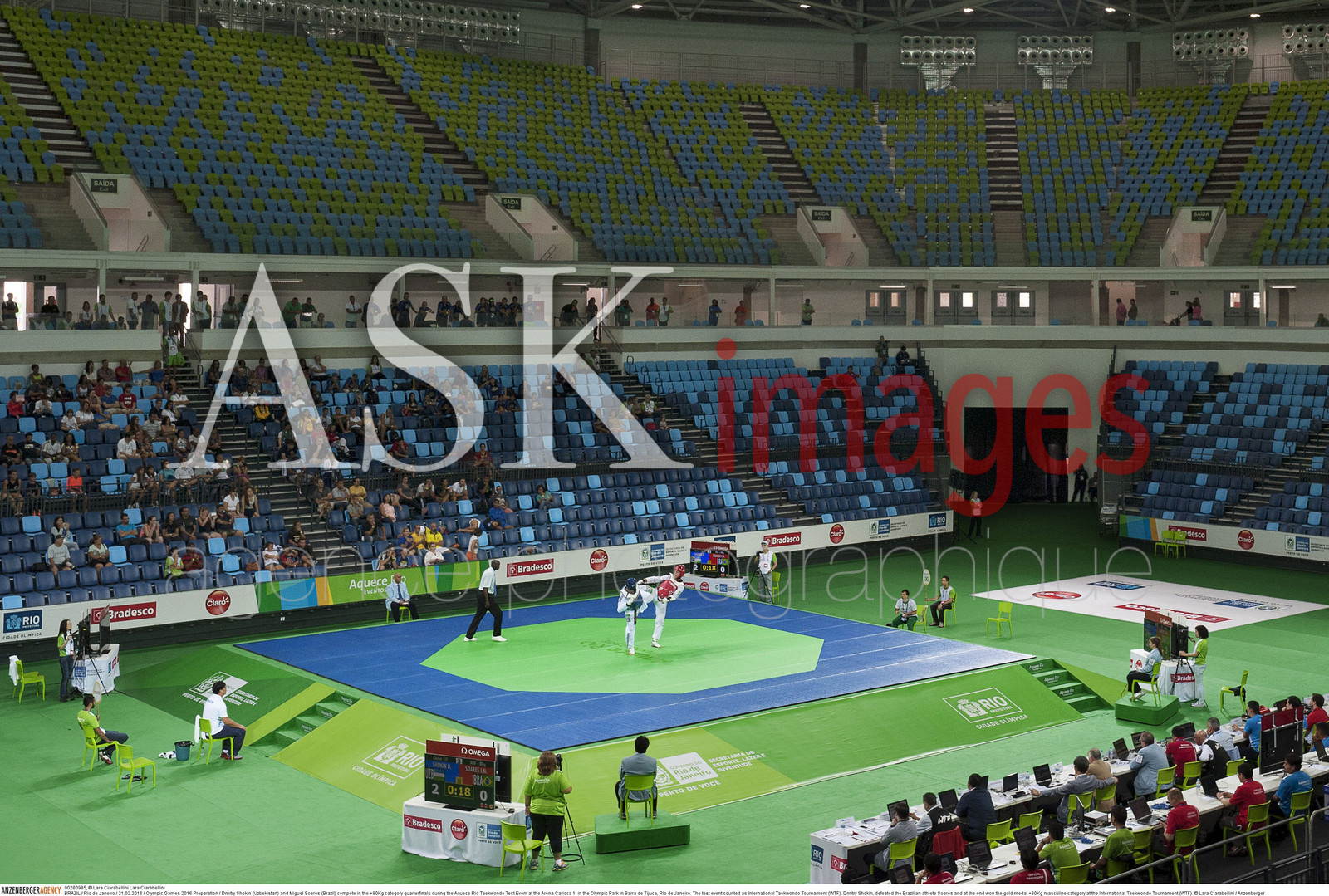 DescriptionBRAZIL / Rio de Janeiro / 21.02.2016 / Olympic Games 2016 Preparation / Dmitry Shokin (Uzbekistan) and Miguel Soares (Brazil) compete in the +80Kg category quarterfinals during the Aquece Rio Taekwondo Test Event at the Arena Carioca 1, in the Olympic Park in Barra de Tijuca, Rio de Janeiro. The test event counted as International Taekwondo Tournament (WTF). Dmitry Shokin, defeated the Brazilian athlete Soares and at the end won the gold medal +80Kg masculine category at the International Taekwondo Tournament (WTF)...© Lara Ciarabellini / Anzenberger