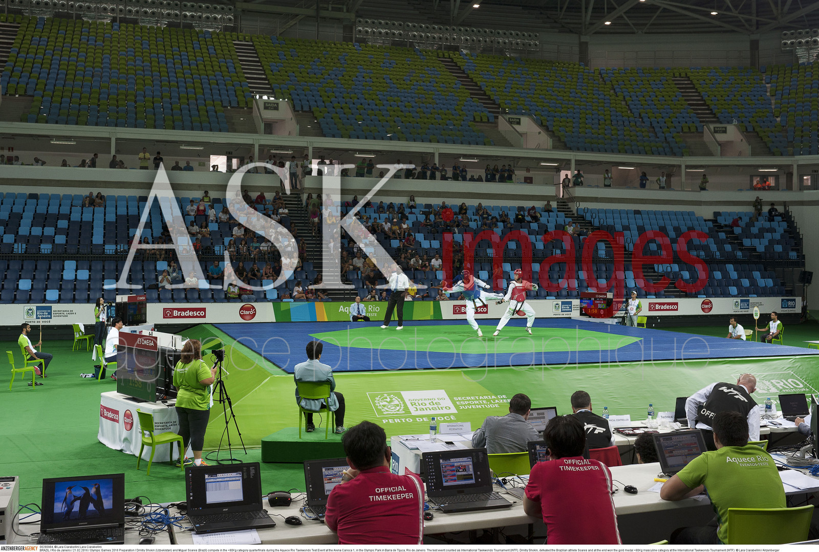 | Description | BRAZIL / Rio de Janeiro / 21.02.2016 / Olympic Games 2016 Preparation / Dmitry Shokin (Uzbekistan) and Miguel Soares (Brazil) compete in the +80Kg category quarterfinals during the Aquece Rio Taekwondo Test Event at the Arena Carioca 1, in the Olympic Park in Barra de Tijuca, Rio de Janeiro. The test event counted as International Taekwondo Tournament (WTF). Dmitry Shokin, defeated the Brazilian athlete Soares and at the end won the gold medal +80Kg masculine category at the International Taekwondo Tournament (WTF)...© Lara Ciarabellini / Anzenberger |
