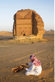 SAUDI ARABIA / Hegra / Mada'in Saleh / sister town of Petra (Jordan), is the symbol of the wealth of the Nabataens civilization (1st Century A.D.) who carved in the sandstone 133 tombs / Nabataens tomb of El Ferid or Mahal el Megless. Bedouin sitting in front of the site