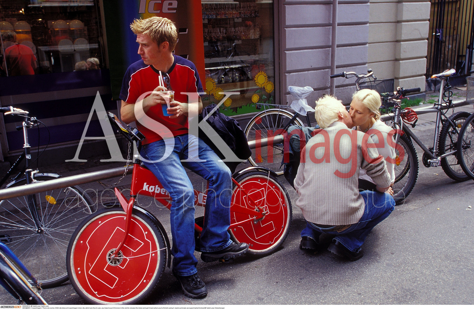 DescriptionDENMARK / Copenhagen / There are some 2500 city bikes at Copenhagen inner city, which are free to use. you have to put 20 kroner in the slot to release the bikes and get it back when you're finnish using it. (same principle as supermarket trolies)