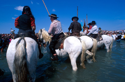 • France, Camargue, Les Saintes Maries de la Mer, Gipsy festival in May, gardians (the cowherds)..