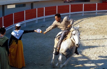• France, Camargue, Les Saintes Maries de la Mer, Bull games, Horse race and acrobatics.