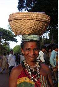 INDIA / KARNATAKA / GOKARNA. A tribal woman balances her basket on her head at the weekly market at Gokarna. Gokarna is an ancient temple town on India's west coast, just south of Goa, facing the Arabian Sea. It is a temple town and centre for Sanskrit studies and is referred to as the Kashi (the ancient name of the holy city of Benares) of the South. In recent years it has been discovered by the 'hippies', western and Israeli tourists due to its close proximity to Goa. © PRASHANT PANJIAR / ANZENBERGER/ASK Images India, Goa