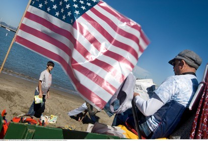 USA, California. San Francisco. Fisherman wharf, a boy on the beach and a man with an american flag relaxing at the beach.
