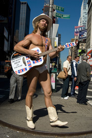 USA, New York. The famous 'Naked cowboy' singing song for the tourist almost all naked in Times Square.