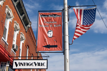 USA, Iowa, Riverside. The flag which indicate the future place of birth of captain Kirk from the tv series Startrek , due this the little town in Iowa is hosting many tourist and also once a year a celebration of Startrek where many fans coming dressed up as they idols.