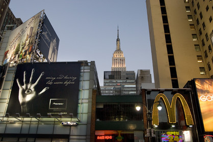 USA, New York. The nightlife at 7th avenue, some advertising on the building of the avenue.