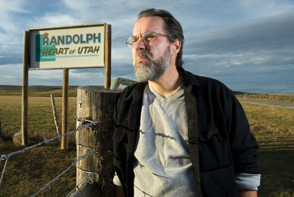 USA, Utah. Randolph. Gage Slusser near by the welcome sign of his little town in Utah called Randolph, The little town is famous as 95 per cent of the people voted for Bush during the 2004 election, Gage was of the few who did not vote for Bush. Gage is the postman of the little town, he lives with his wife and two children.