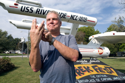 USA, Iowa, Riverside. The Mayor of Riverside Bill Poch doing the typical gest of the fi'ger posing in front of the spaceship of TV series "Startrek' is posed in a little park of Riverside where they believe that Captain Kirk will born in 2228.
