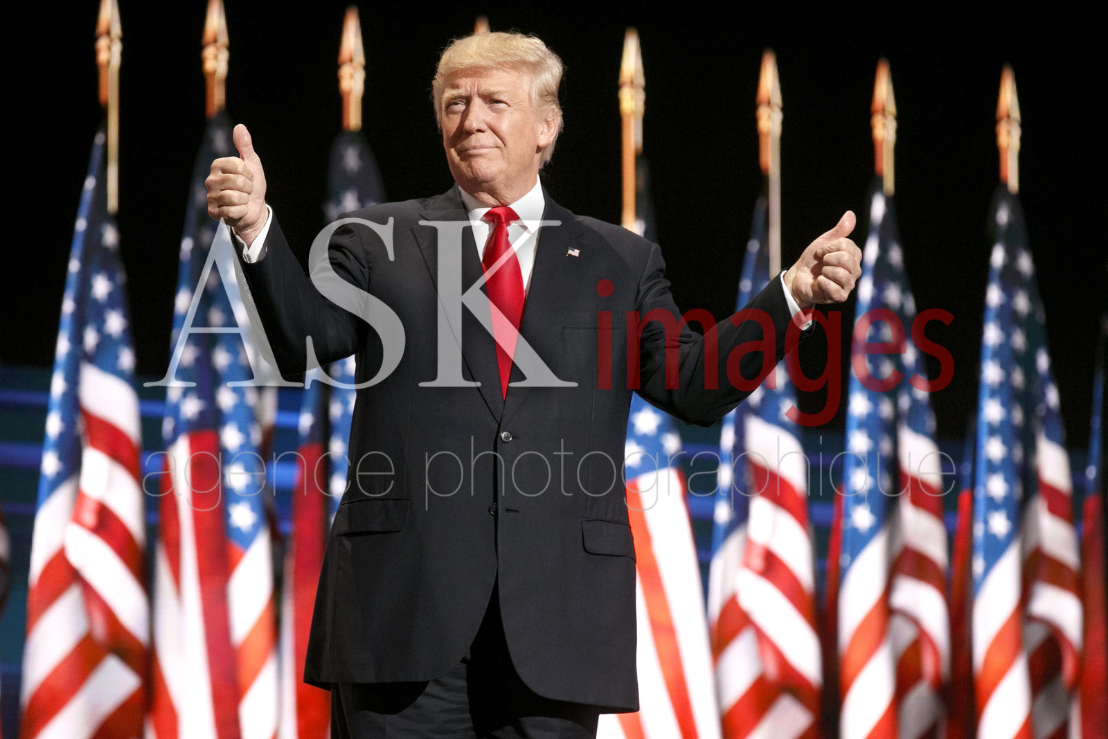 | Description | Cleveland , Ohio, July 21, 2016: Donald Trump gives a thumbs up to the audience during his entrance. The 2016 Republican National Convention in Cleveland. ©The Star-Ledger / Aristide Economopoulos / The Image Works/ASK Images |