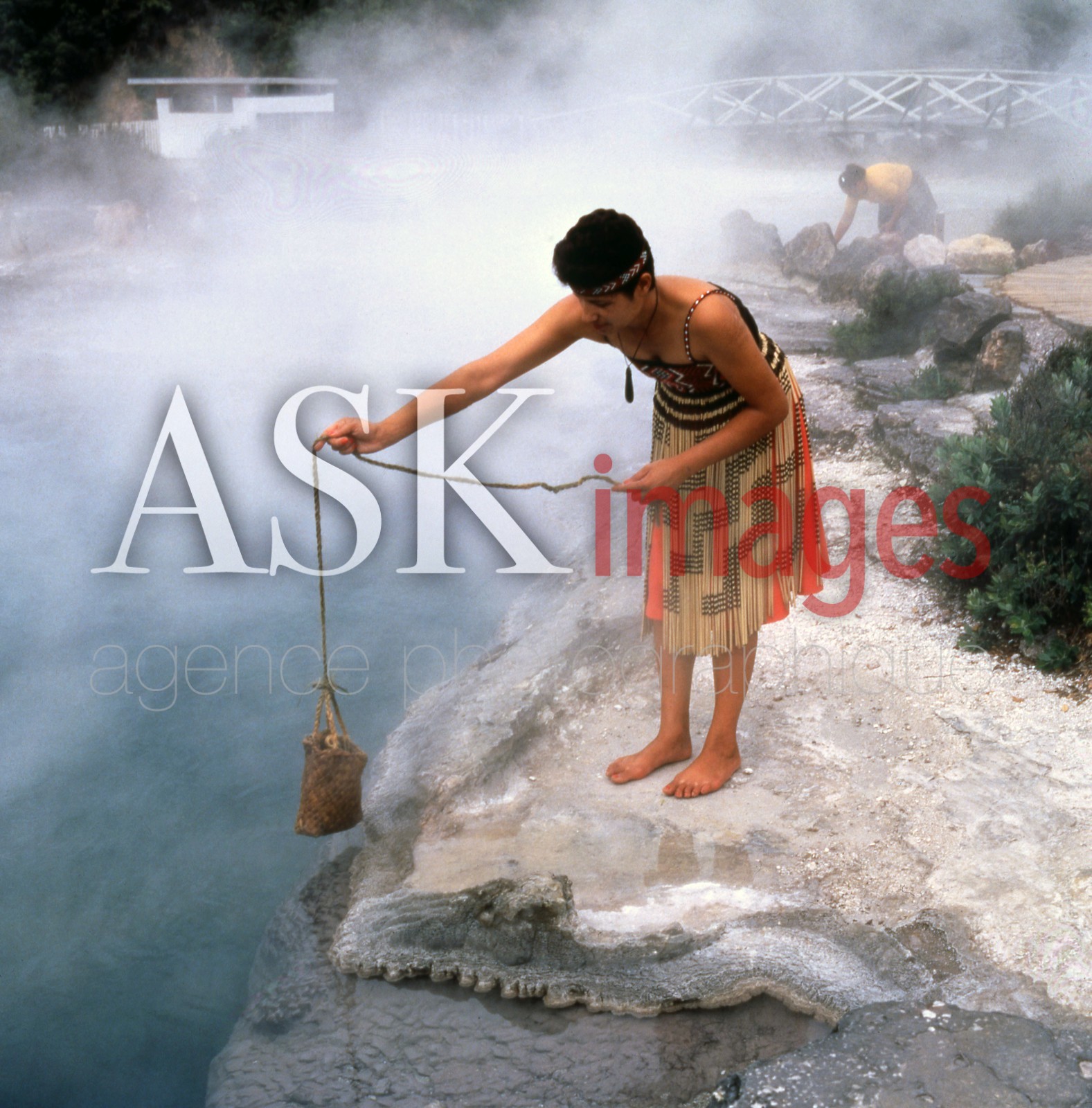| Description | A Maori woman is cooking in hot spring, Whakarewarewa, Rotorua, North Island, New Zealand. |