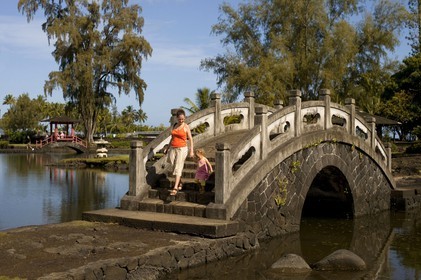 Japanese-style garden Liliuokalani Park in Hilo. Big Island. Hawaii. USA. It has bridges, koi ponds, pagodas, statues, torii and a Japanese teahouse.
