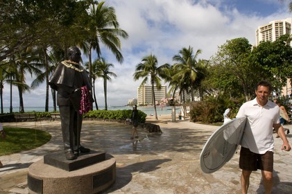 Surfer on the famous Waikiki Beach. United States, Hawaii, Oahu island, Waikiki beach, statue of prince Kuhio. Kalakaua Avenue. O'ahu. Hawaii. Located on the south shore of Honolulu, the world-famous neighborhood of Waikiki was once a playground for Hawaiian royalty. Known in Hawaiian as "spouting waters," Waikiki was introduced to the world when its first hotel, the Moana Surfrider, was built on its shores in 1901.